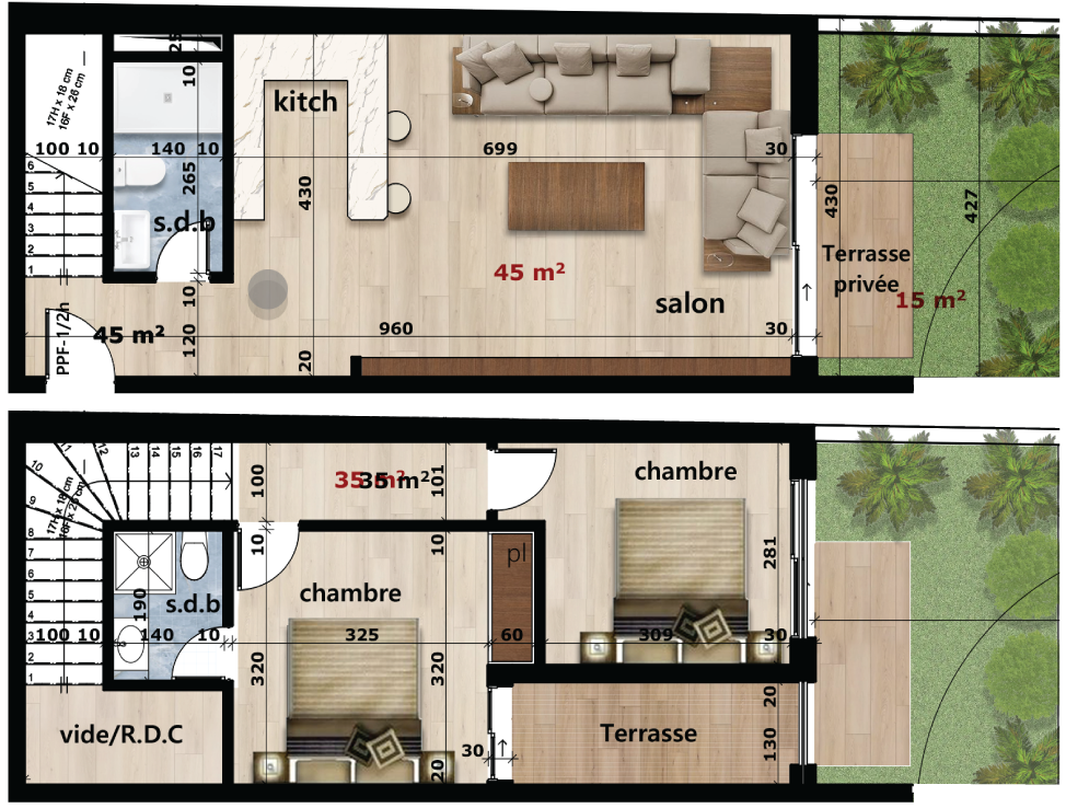 Pensés pour allier élégance et fonctionnalité, nos duplex haut standing de 80 m² offrent un cadre de vie confortable et contemporain. Chaque unité comprend deux chambres, un salon spacieux, deux salles de bains, une cuisine équipée et une terrasse, le tout agencé avec soin pour un quotidien aussi pratique que raffiné.