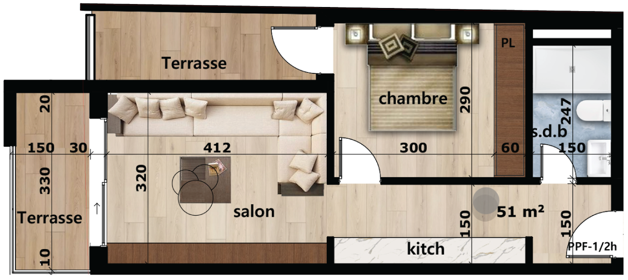 Pensés pour offrir un équilibre entre fonctionnalité et confort, nos studios à partir de 40 m² s’adressent aussi bien aux particuliers qu’aux investisseurs. Chaque espace intègre une chambre, un salon, une cuisine équipée et une salle de bains, dans un cadre moderne et agréable à vivre.